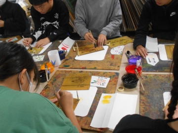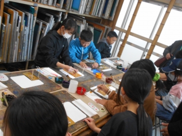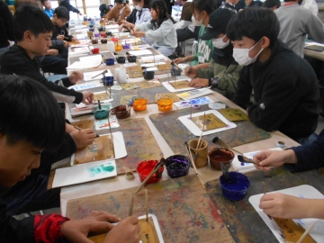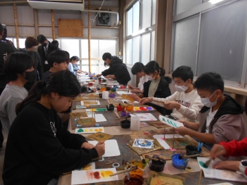 次は、友禅染体験です。白いハンカチに、自分でデザインを選んで染めていきます。説明を聞く姿勢、実際の作業、どれも真剣そのもの。作業を進めるうちにコツをつかんで、どんどん上手くなっていきました。