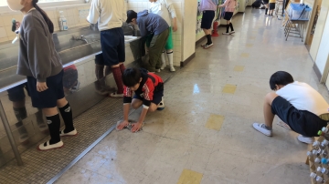 次は、3つのグループに分かれて順番に、煙体験、消火器体験、消防車見学を行いました。煙で何も見えなくなる恐怖を体験したり、消火器を自分で操作したり、消防用のホースを持たせてもらったりと、様々な体験をさせていただきました。