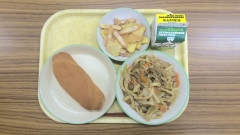 小型玄米パン 牛乳 焼きうどん ベジタブルチップス