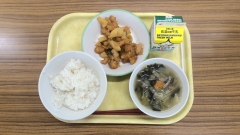米飯 牛乳 鶏肉のからあげ 昆布あえ ワンタンスープ