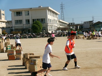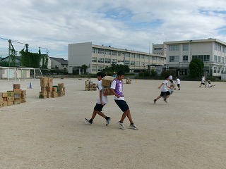 1年生は、今夏を思い起こさせる暑さにも負けず、元気いっぱいに大切な荷物を運んでいました。各クラスでみんなで輪になって話し合っている姿や、実際に様々な工夫を試す姿などがみられました。体育祭本番に向けて、どのクラスも精一杯、努力を重ねていました。