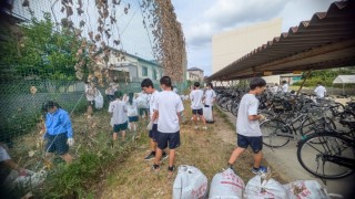 本日の作業はというと…1、2年生は草を袋に詰める作業や切られた木を運ぶ作業など、みんな一生懸命に作業をしてくれていました。3年生明の体育祭のためのテント設営やグラウンドづくりを中心に準備し、その準備が終わると草を集める作業や石拾い等に参加してくれました。どの学年も、どの生徒も大活躍でした。