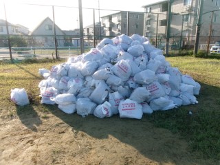 45分間という短時間で、至る所に集められていた草山はなくなり、草を詰めた袋の山が出来上がりました。その数は約600袋です。