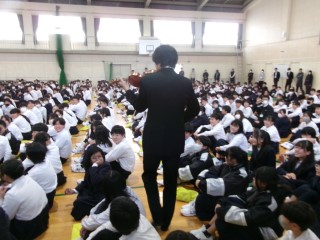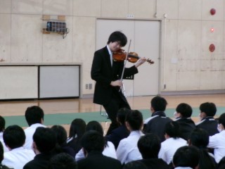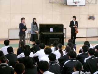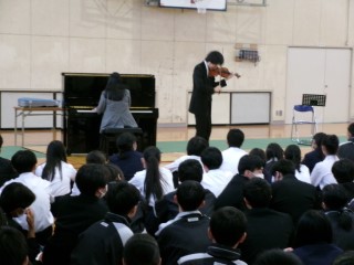 関西を代表するオーケストラ(関西フィルハーモニー管弦楽団)から、コンサートマスターの堀江恵太さん詩葉さん兄妹に来ていただき、楽器や曲の説明を加えながらピアノとバイオリンのミニ演奏会をしていただきました。G線上のアリアやヴィバルディーの秋など、中学生にもなじみのある曲をはじめ、最後は葉加瀬太郎さんの情熱大陸を演奏してもらい、みんなおおいに盛り上がりました。