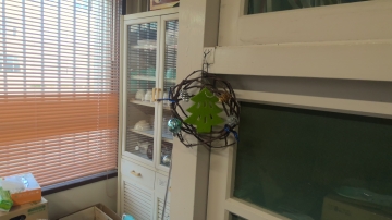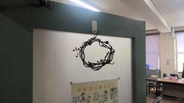 さつまいもの収穫の際に残しておいたツルで作ったリースを飾りつけしました。