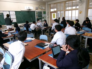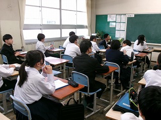 三重大学教育学部の学生さんたち約20名が、山手中学校で社会科の授業参観を行いました。学生さんたちから話を聞くと、教育学部といえども、実際教職に進むのは例年6~7割なのだそうですが、今年度の4年生は8割ほどが教職を目指しているそうで、大変うれしいことです。学生さんたちは、今日の授業やそれを受ける山中生の姿を参観してどのように感じたでしょう?中には後ろに掲示してある学級通信をみて、感嘆の声を上げている学生さんもいました。たくさんのことを感じ、将来に生かしてもらえればありがたいです。