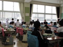 4月も後半になりました。1年生にとっては今日は7回目の給食となります。給食初日は全員が静かに座り、先生たちにパンやおかずなど全て配膳されていました。写真は今日の教室の様子です。配膳の仕事を終え、やれやれとエプロンを外している給食当番の姿がありました。1週間余りで自分たちにできることが少しずつ増えていく喜びも感じられました。給食当番のみなさん、お疲れさま。