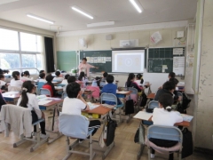 4年生の外国語(英語)の授業。「今日の天気は?」に対し、「晴れ。」「曇り。」「雨。」と天気の会話を学ぶ場面。「sunny」「cloudy」「rainy」など、英会話を楽しむ様子が見られました。何より英語の歌に合わせて声を出す時間は、盛り上がって元気よく発音していました。たくさん『英語に触れ』、『英語が楽しくなる』といいですね。