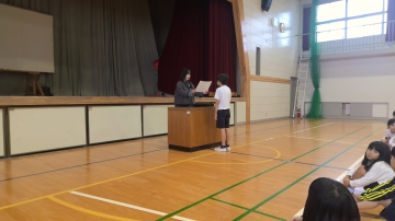 全校練習を1時間目に行いました。昨日までの雨とは違い、とても良い天気の中の全校練習です。『良い姿勢で話を聴く』ことをめあてとして取り組みました。児童代表の子どもたちやラジオ体操の見本として前に立つ子どもたちも、本番に向けて、動きを確認しました。全校練習は1回しかありませんが、開会式・閉会式の動きはイメージできたようです。